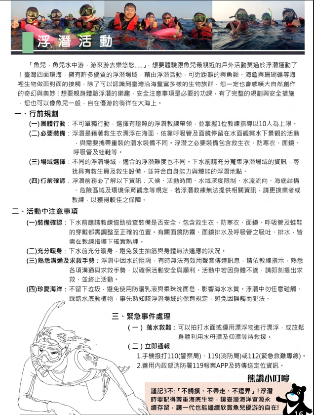 內政部消防署業透過優化既有系統,進一步將過往歷史案 件的大數據統計分析結果加值應用,並於113年度完成建置 「民眾水域活動資訊服務網頁」(網頁連結: https://watersafe.nfa.gov.tw/watersafe/),為擴大該 網頁使用成效及使用族群,提供貴校強化水域安全宣導及 參考,請貴校多加利用。