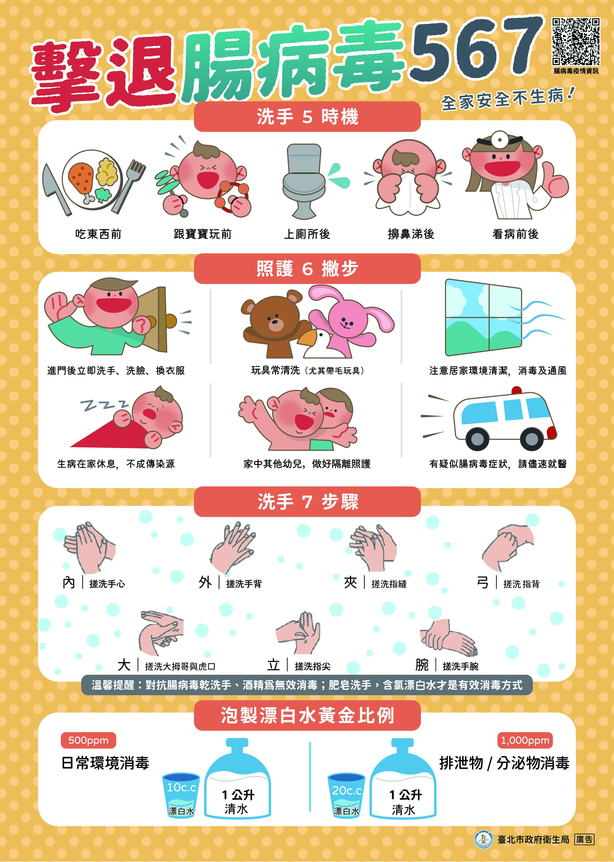 北市衛生局表示,腸病毒主要傳播途徑為糞口、飛沫及接觸傳染,無論大人、小孩都有可能感染腸病毒。因腸病毒沒有套膜,酒精乾洗手對腸病毒無抑制效果,掌握洗手5時機,於吃東西前、跟寶寶玩前、上廁所後、擤鼻涕後及看病前後,均落實肥皂勤洗手才能有效預防腸病毒。環境消毒以含氯漂白水為有效的消毒方式,日常環境可使用500ppm漂白水(漂白水:水=1:100)擦拭,如排泄物或嘔吐物則使用1,000ppm漂白水(漂白水:水=1:50),至少浸泡30分鐘,以澈底消毒,再行清潔。